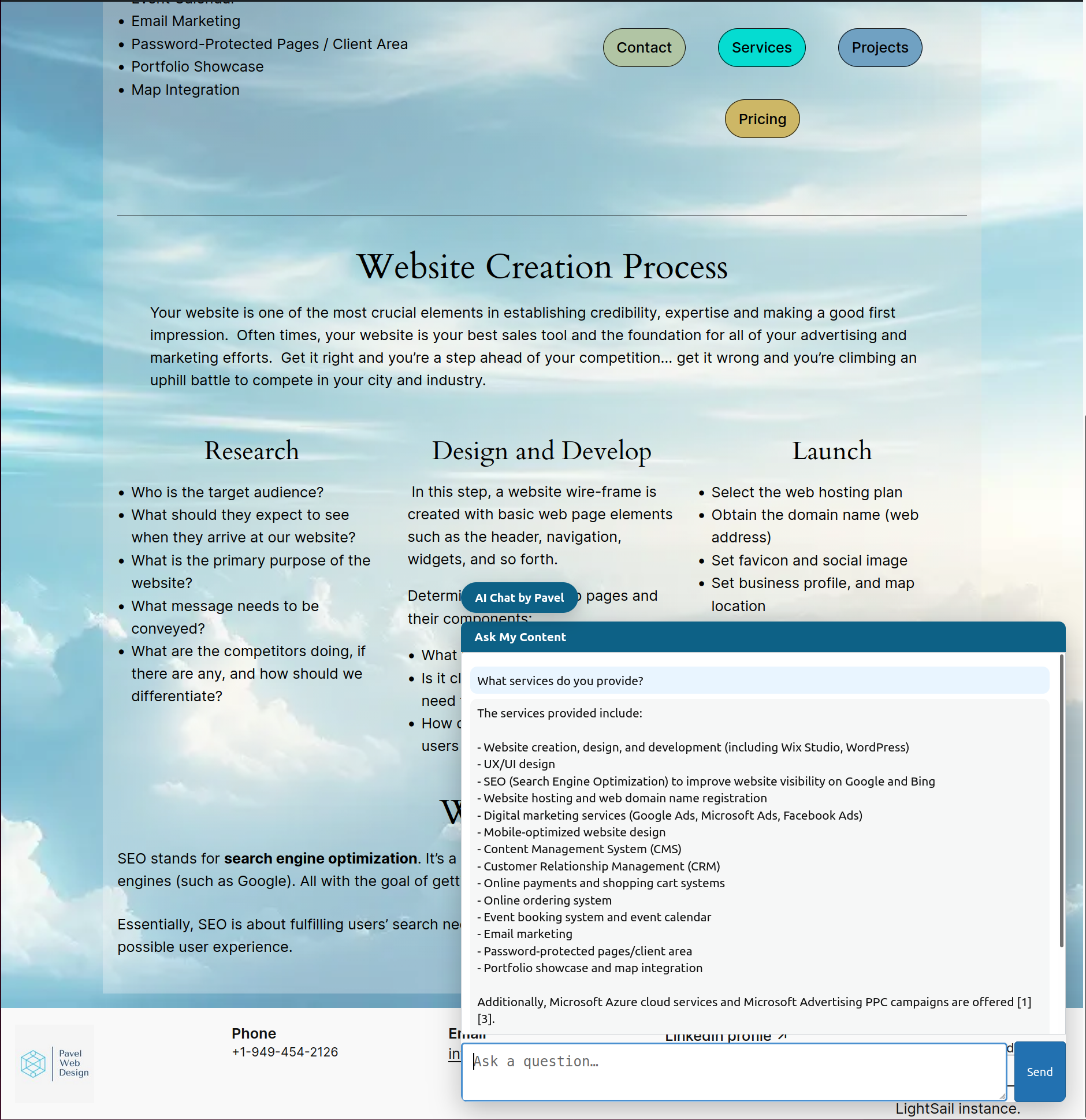 * Retrieval Augmented Generation (RAG) – answers are grounded in your actual site content.