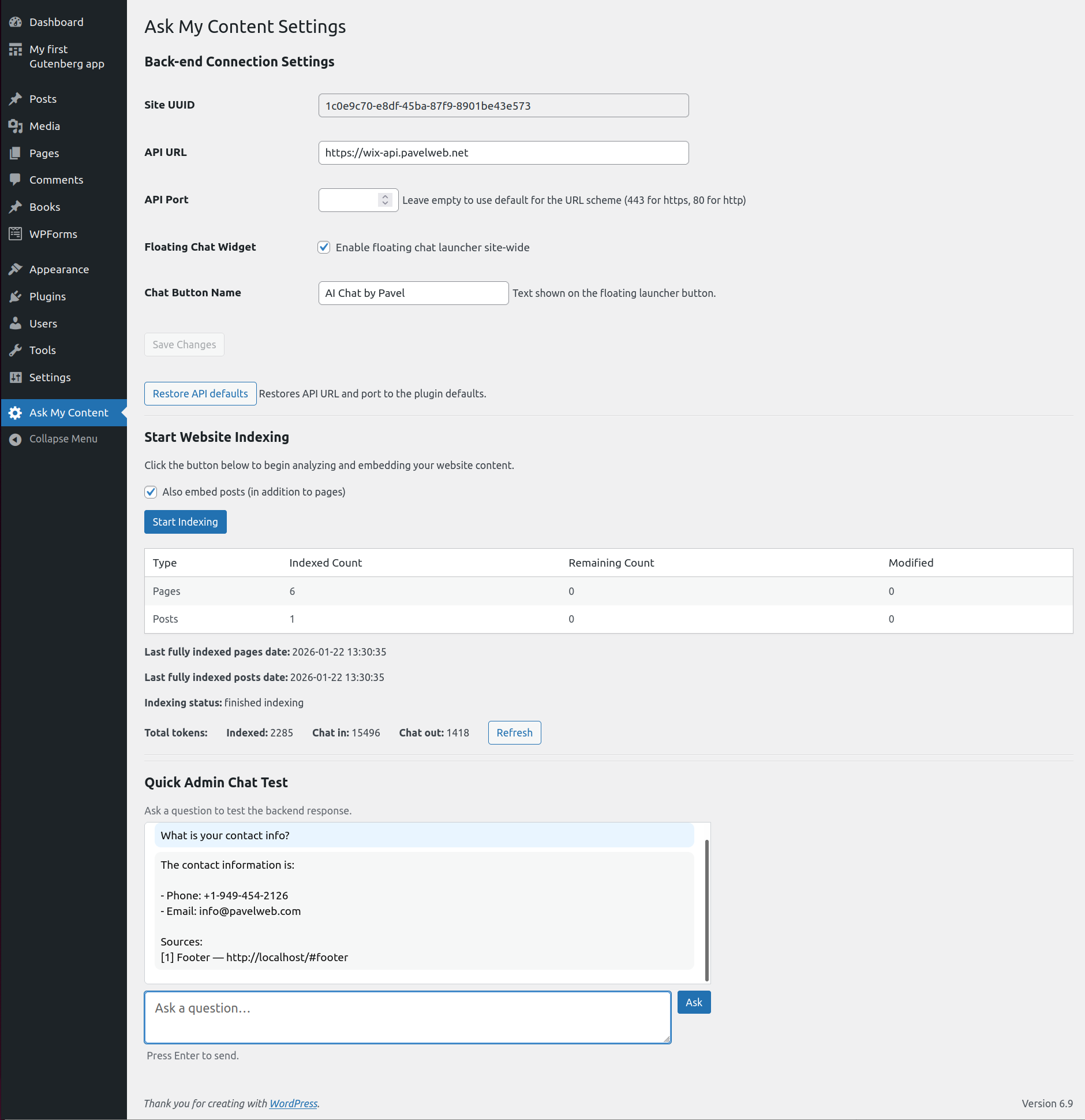 1. After activating the plugin, go to Dashboard Ask My Content and press “Start Indexing” (or run wp amc index) to send your site content to the backend. Indexing must be completed before the chat can answer questions.